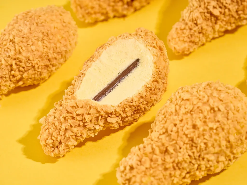 Looks like fried chicken, tastes like pure magic. This ice cream creation mimics a crispy drumstick, but surprise – it’s all sweet, creamy fun! Silky waffle-flavored ice cream hugs a chocolate-dipped cookie ‘bone,’ all coated in crunchy white chocolate and golden cookie crumbles.